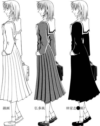 現在執筆中のBLEACH絵の仕上げ方についてちょっと考えています。 僕はギルティの場合、配色が複雑なのでトーンを多めに使って描いています。 その影響でマリみてもトーン多めなんですがBLEACHはどうしようか悩み中です。 原作では髪も服装も黒いところは全てベタ。 モノクロだけじゃなくてカラーでも黒いところは色の段階ナシのベタ塗りです。 トーンによる中間色を多用する僕の絵柄とはちょっとマッチングがよくないんですよ〜。 昨日の日記絵の聖を例に取って描いてみたのが今日の日記絵。 左が線画。 真ん中がいつもの僕の仕上げ方。髪や制服にも2重にトーンを貼って中間色を表現しています。 右がコントラスト高めた仕上げ方。林家志弦先生風な感じですね。 僕が中間色を多用するのは…ベタだとせっかく描いた線画潰れて勿体ない感じがするからです(笑)。 右の絵のように思い切ってベタ塗りした方が漫画としては見やすいとは思うのですが…。 そんな感じで色々試しながら仕上げてみます。 ☆CG 定点観測様ご紹介ありがとうございました。 1月17日(火) BLEACH 夜一と砕蜂の漫画(仮) ペン入れ 7P 合計 7P |